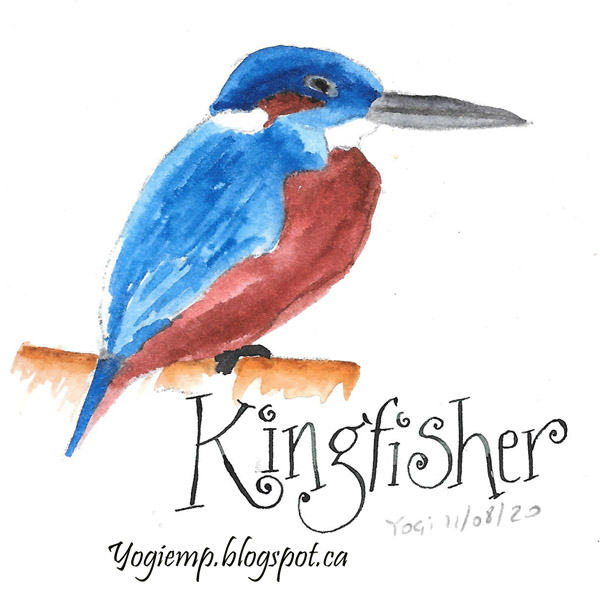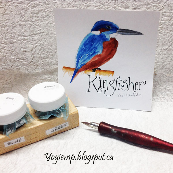 Day 11: (Kingfisher) Staples white 110# cardstock. Zebra G nib and blue Bister ink. Bird painted with Peerless Transparent watercolors |