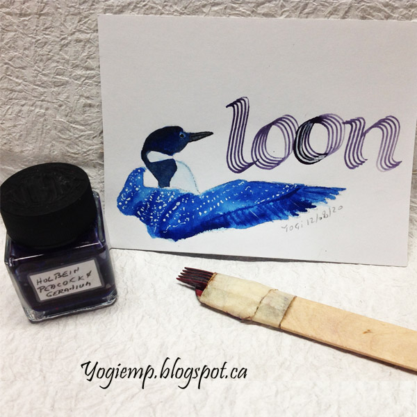 Day 12: (Loon) On white Staples 110# cardstock. Hand made Stimudent tool and Holbein gouache (Peacock mixed with Geranium). Bird painted with Peerless Transparent watercolors |
