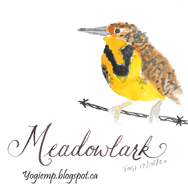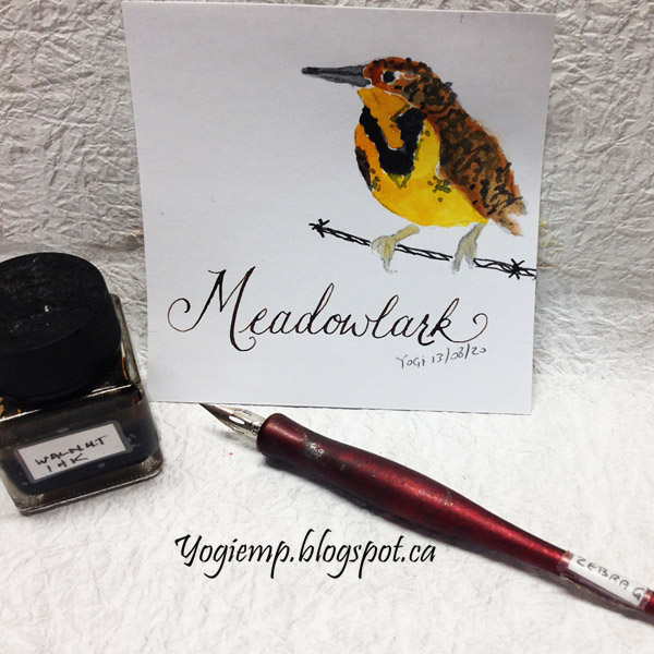 Day Day 13: (Meadowlark) On white Staples 110# cardstock. Zebra G nib and Walnut Ink. Bird painted with Peerless Transparent watercolors |