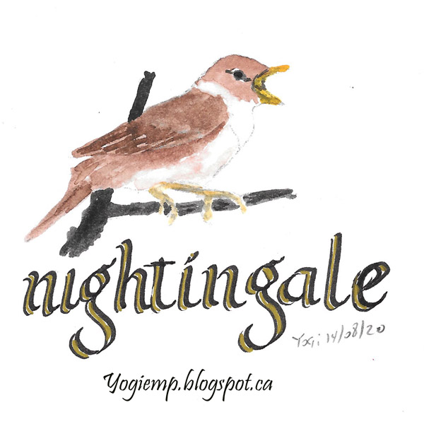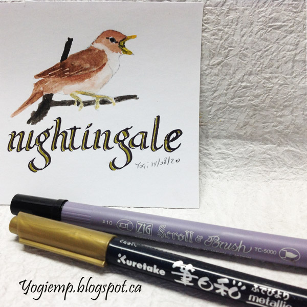 Day 14: (Nightingale) On white 110# cardstock, Zig black dual Scroll/Brush pen. Filled the negative spaces with Kuretake Gold Metallic pen. Bird painted with Peerless Transparent watercolors