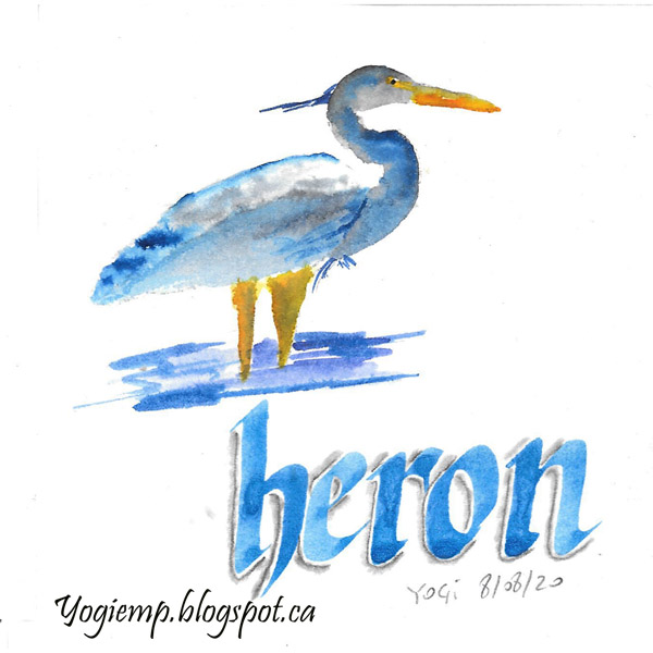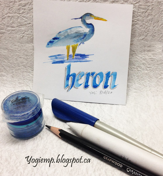Day 8: (Heron) Staples white 110# cardstock. 6.0Parallel pen and Calligraphica Crystals "Blue Electric". Shadowed with a 9B graphite pencil and paper stump. Bird painted with Peerless Transparent watercolors |