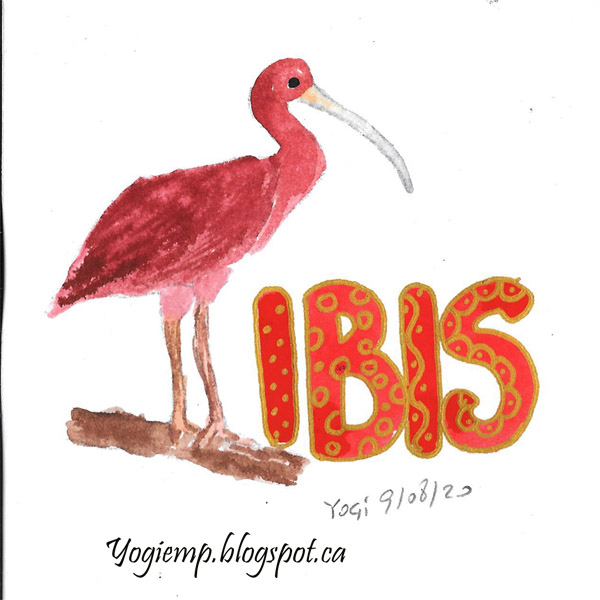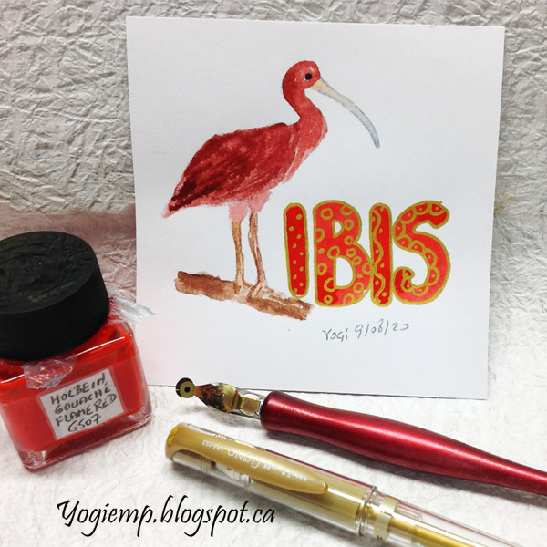 Day 9:(Ibis) Staples white 110# cardstock. B-5 nib and Holbein gouache "Flame Red". Gold gel pen doodles. Bird painted with Peerless Transparent watercolors