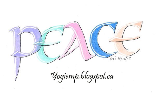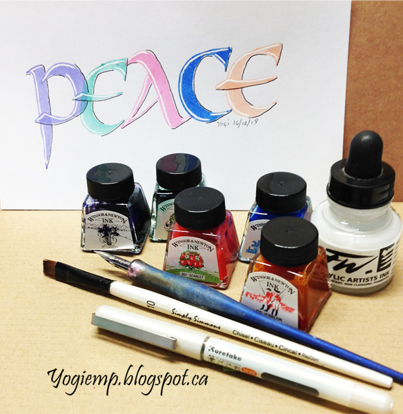 ID: "Peace" More ink I haven't used in eons... Wrote each Uncial style letter, dipping my flat edge brush in a different color of Winsor and Newton ink for each letter on 110# Staples cardstock. Sadow outlined the letters with the Kuretake pen. Highlighted each letter with my Niko G pointed pen nib and the FW white acrylic ink. |