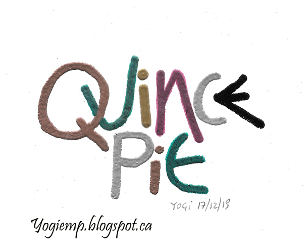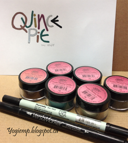 ID: "Quince Pie" Used the bullet tip of the black Zig Writer for my monoline letters on 110# Staples cardstock. Inked the letters one at a time with the Versamark embossing pen. Thermal embossed with Emerald Creek Quietfire Design "Modern Gilding Powders". They work beautifully. "Copper Scroll", "Acanthus Teal", Kells' Gold", "Dragon Berry", "Burnished Silver", "Gothic Black". |