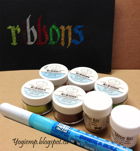 ID: "Ribbons" Inked my letters with my parallel pen on black Recollections cardstock and then applied the glue to a letter, sprinkling with the Elizabeth Craft Designs or Glitter Ritz micro fine glitter. |