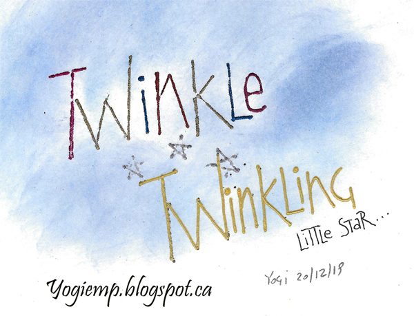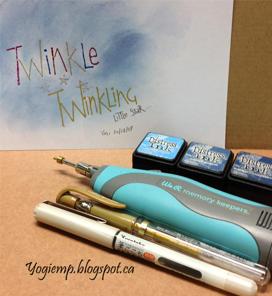 ID: "Twinkling" I wrote the word "Twinkle" using the We R Memories battery operated foil heating tool. Not as good a tool as my Staedtler battery operated Hot Foil Pen which I've had for more than 10 years. But since I broke the tip on it, I had no choice but to buy another foil pen... Sigh. Then I read the word list and realized I was supposed to write "Twinkling". Sheesh. So wrote it with a gold gel pen. Added some hot foil stars, and sponged the background with Distress blues. Added the words "Little Star with a black Kuretake fine tip pen. |