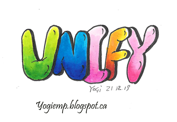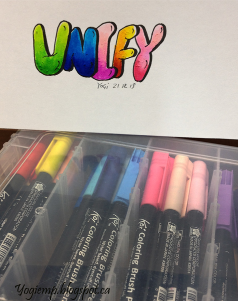 ID: "Unify" I love Graffiti style lettering, all the shadows and highlights they add. Used the Koi watercolor markers (another set of pens I never use...) on 110# Staples cardstock. I used 3 values of colors for each letter. Added the shadows with a Zig Writer.