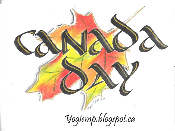 Day 1: (Canada Day) Staples white 110# cardstock. 6.0 Parallel pen and Sumi ink in Uncial style lettering. Gold gel pen details. Prisma colored pencil maple leaf. Graphite shading |