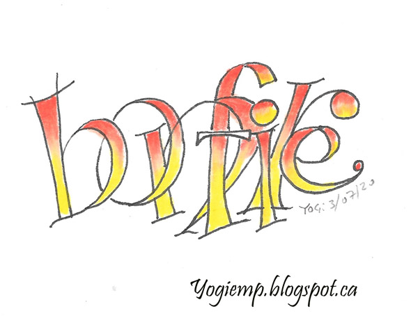 Day 3: (Bonfire) Staples white 110# cardstock. Black Zig Writer outlined the letters in one of my funky styles. Prisma colored pencils