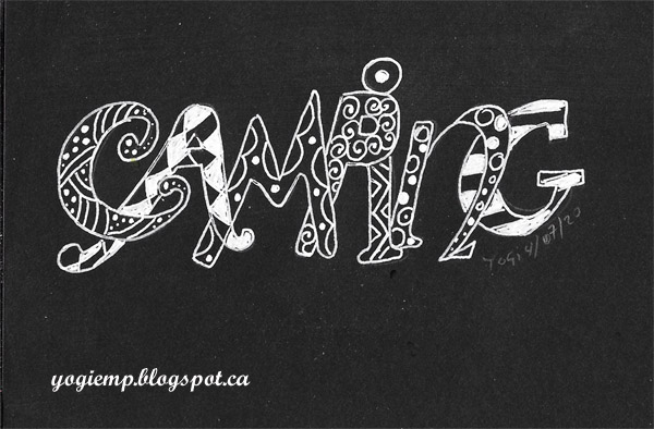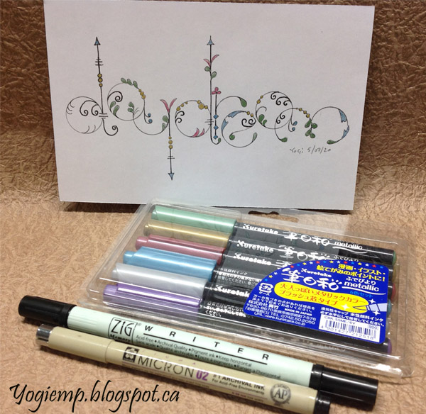 Day 5: (Daydream) On white Staples 110# cardstock, using a Zig Writer and a Micron pen wrote out the letters (Moshik style). Colored wit Kuretake metallic markers. |