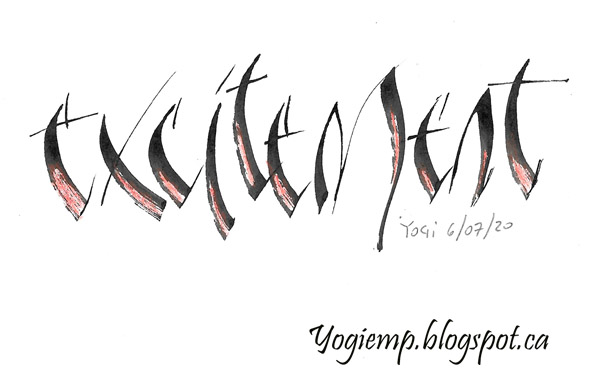 Day 6: (Excitement) On white Staples 110# cardstock, using a 6.0 Parallel pen and Sumi ink wrote out my word - my ink flow conks out by the time I get to the bottom of each letter leaving these white spots... Sometime I appreciate that and sometimes it drives me crazy... Used a red Prisma colored pencil to fill in the white area. I saw a word done by Rachel Yallop at the begin of 2016 (thanks) and used that as my exemplar to create the rest of the alphabet.