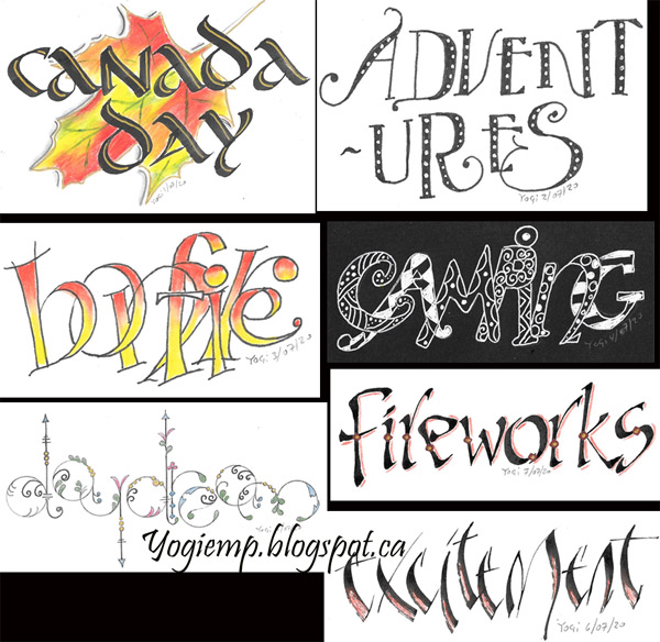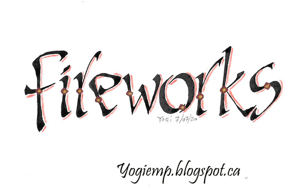 Day 7: (Fireworks) On white Staples 110# cardstock, using a 3.8 Parallel pen and Sumi ink wrote out my word. I saw this style lettering in Letter Arts Review 26.4 (Dec/12) by Margaret Morgan. She had written the word "Frances" and I used that as my inspiration for the rest of the letters. Added a red highlight and a Kuretake Metallic red diamond with a gold gel pen dot in each center.