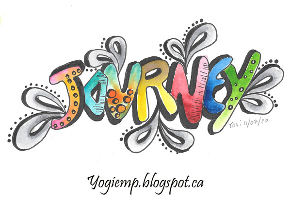 Day 11: (Journey) I love graffiti style lettering... Staples white 110# cardstock. Drew in my letters using a Zig Writer. Painted with Peerless watercolors. They come in approx 4 x 6" sheets of pure color. I cut mine down to 1" x 1/2" and adhered to a large piece of clear plastic (8.5 x 11"), slipped it into a plastic binder sleeve with a piece of paper behind with the names and color swatch for each. Great for traveling with. |