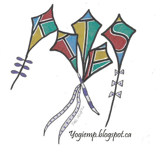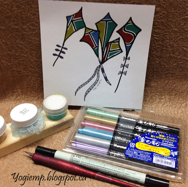Day 12: (kites) On white Staples 110# cardstock, using a Zig Writer drew my kites and the letters. Colored with Kuretake metallic markers. Added white lines on either side of my letter strokes to make them pop using Bleed Proof white and a pointed nib. |