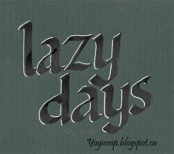 Day 13: (Lazy Days) On dark green textured cardstock, using a 6.0 Parallel pen and Sumi ink wrote out my word (Foundational style) - added a white gel pen highlight.