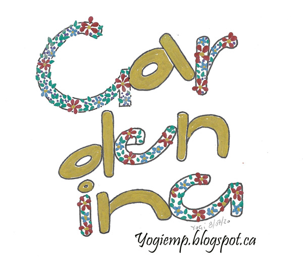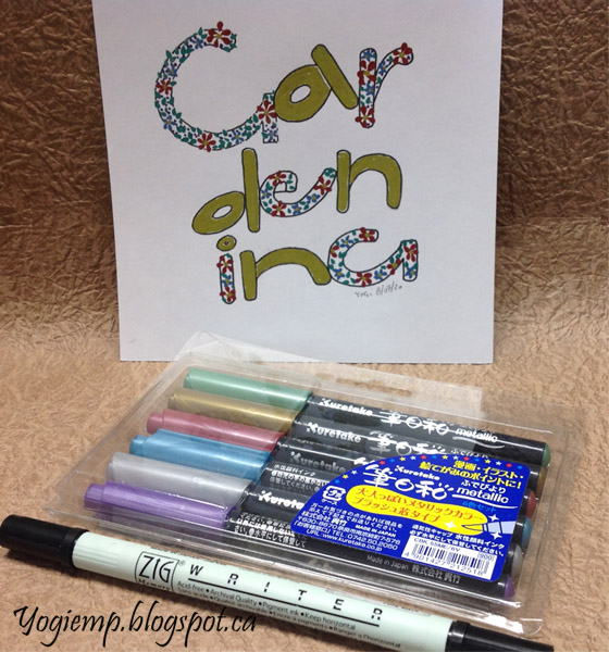 Day 8: (Gardening) Staples white 110# cardstock wrote out the word using a Zig Writer. Used the Kuretake Metalic Markers to create flowers and leaves in alternate letters. The balance done with the gold marker. |