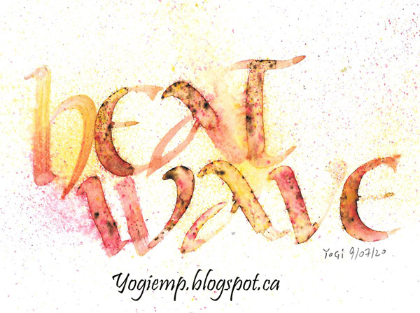 Day 9: (Heatwave) Staples white 110# cardstock. I used a Simply Simmons Chisel #8 brush. Using my Tim Holtz Glitter Dusters and Bister powders (yellow and red) dusted some on my cardstock. Wet my brush and created the letters (Uncial style). When dry, misted lightly with Tim Holtz Mini Mister (gives a really fine mist). It seems some of my powder stuck to the cardstock giving me a splattered effect...