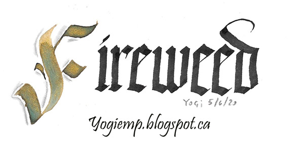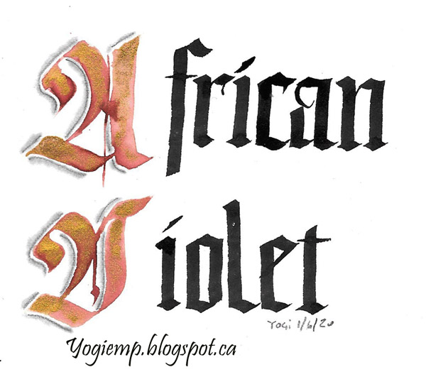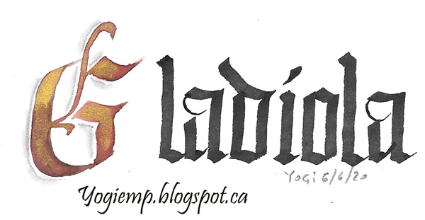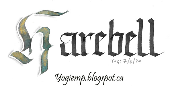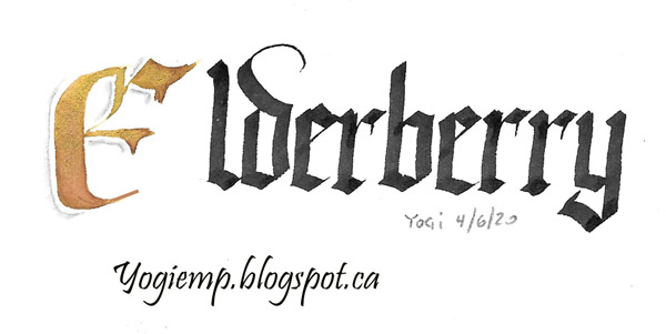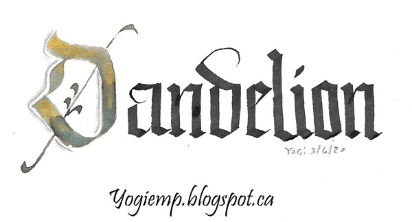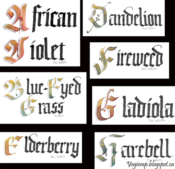 May 30, 2020 I usually love challenges and this one is right up my alley. All words are done on Arches 90# HP watercolor paper. Using 6.0 & 2.4 parallel pen for the capital letter and 3.8 for the rest of the text. Dropped various colors of Bister ink into wet letters and then some Gansai Tambi gold accents. Black letter style lettering. Each letter is approx 5"w x 2"h with the larger words being a bit larger.