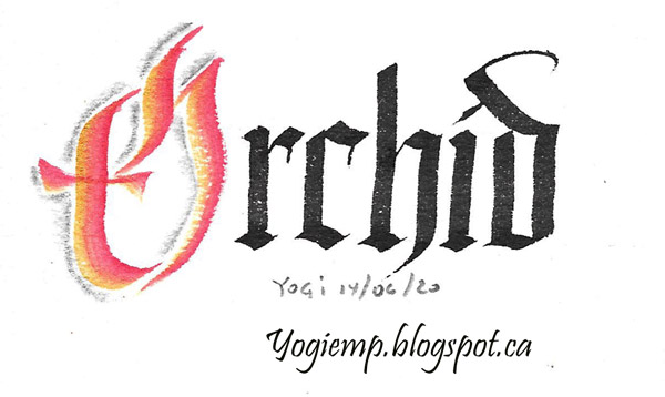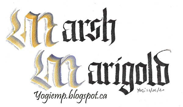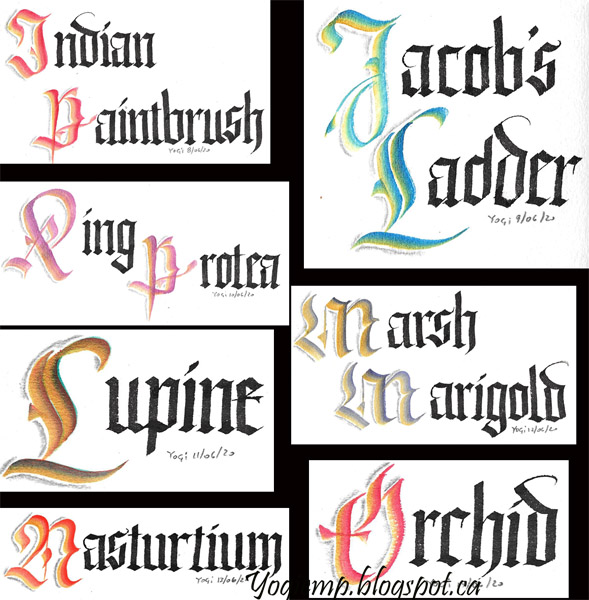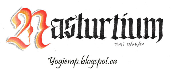 May 31, 2020 I usually love challenges and this one is right up my alley. Working on Arches Text Wove paper, Princeton Chisel Blender # 6 for the caps, double loaded with either Golden Fluid Acrylics or Stamp Oasis Luna Lights paint. A 3.8 Parallel pen for the remaining text with Sumi ink. A 4B graphite pencil and paper stump for cap shading. All the caps have Golden's "Iridescent Bright Gold (Fine)" as one of the double loads.