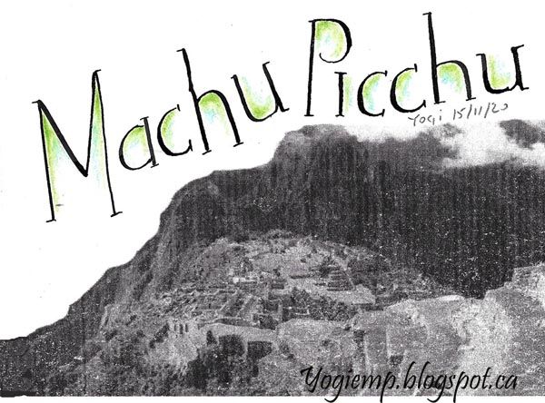 Day 15: Machu Picchu Pointed pen lettering, Prisma colored accents |