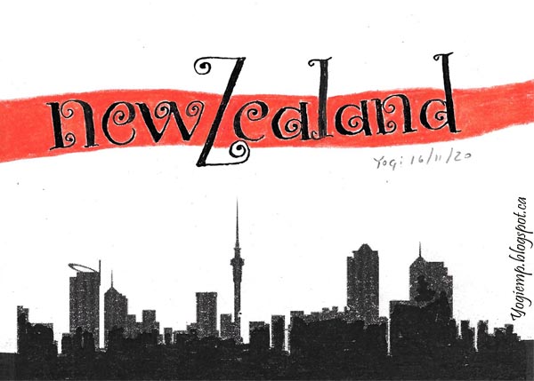 Day 16: New Zealand Used a 2.4 Parallel pen and Sumi ink in a "Curlz" style lettering. Added the red Prisma colored band.