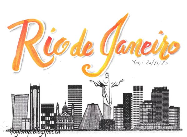 Day 20: Rio de Janeiro Used 2 Color Brush pens (yellow and red), lightly hitting the red one with the yellow and writing getting the variegation. Shadowed with a graphite pencil and paper stump.