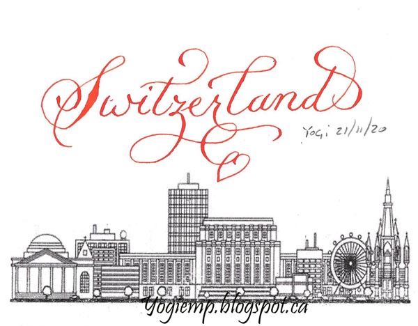 Day 21: Switzerland Using a pointed pen and Vermillion Sumi ink.