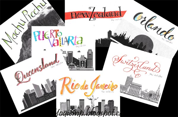 November 4, 2020 I usually love challenges and this one is right up my alley. They are all 4.25"h x 5.5"w All are done on Staples 110# white cardstock. I looked up the places mentioned to view skylines and printed it out on my cardstock. Then looked up lettering styles for those places and tried to emulate something I liked. I'm happy with the results.