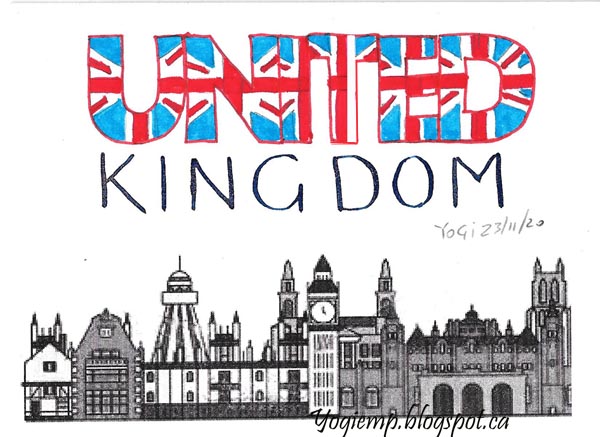 Day 23: United Kingdom Drew the letters for "United" and outlined with a red Zig Writer. Used Color Brush pens to color the design. Wrote out "Kingdom" with pointed pen and Holbien gouache (mix of Prussian Blue and Rich Gold)