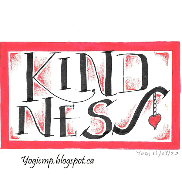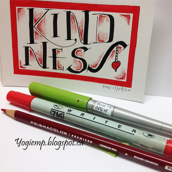 Day 11: (Kindness) Bee Super Deluxe paper. 3.8 Parallel pen and Sumi ink. Border and heart colored with Red Pentel Color brush. Prisma colored pencil shading. |