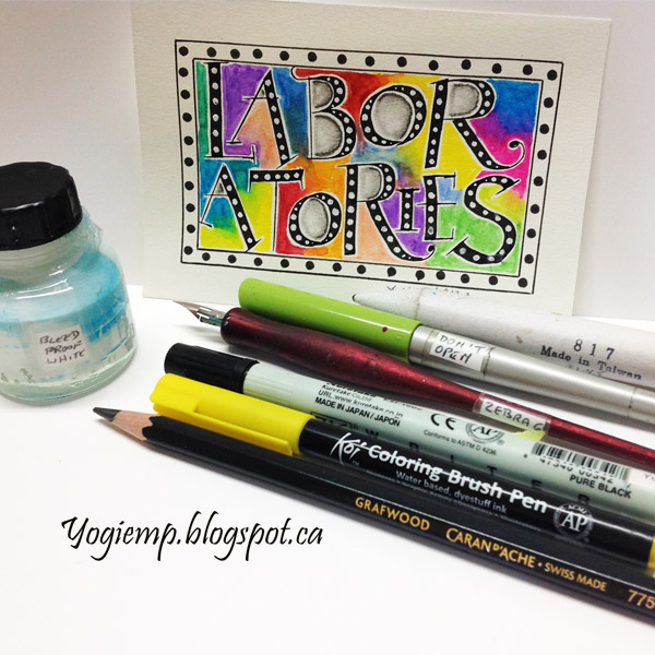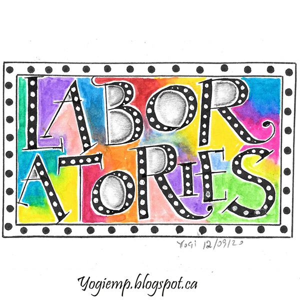 Day 12: (Laboratories) Bee Super Deluxe paper. 3.8 Parallel pen and Sumi ink. Koi Color Brush pens blended with water. Dr Martin's Bleed Proof white dots and black Zig Writer bullet dots.