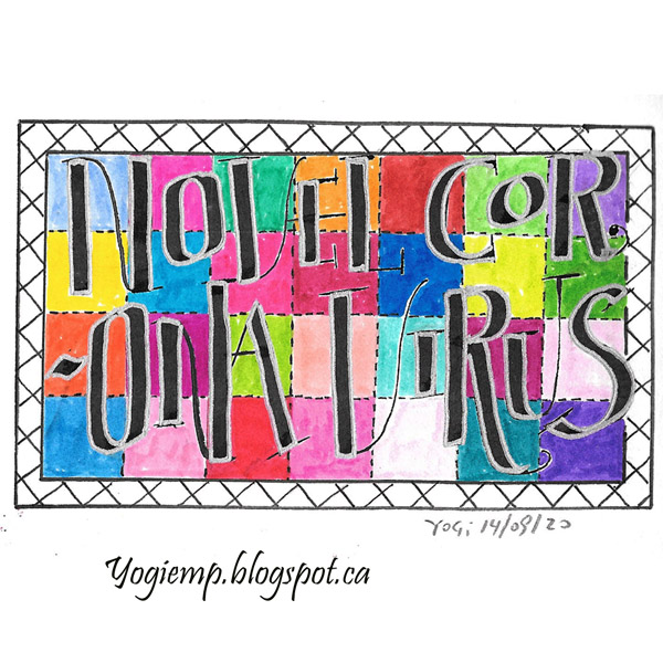 Day 14: (Novel Corona Virus) Bee Super Deluxe paper. 3.8 Parallel pen and Sumi ink . Patchwork quilt using Koi Color Brush pens and Micron .02 dash lines. Cross hatched border. Large strokes of letters outlined with a silver gel pen.