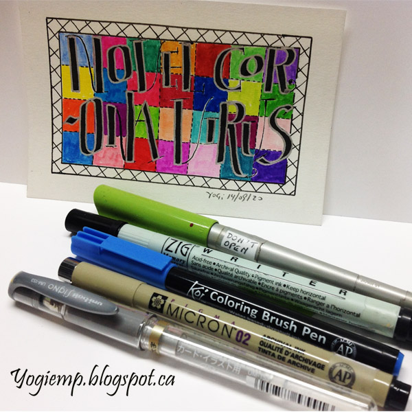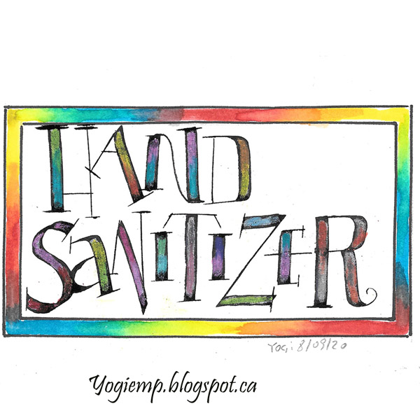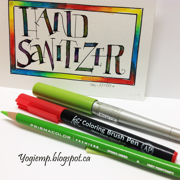 Day 8:(Hand Sanitizer) Bee Super Deluxe paper. 3.8 Parallel pen and Sumi ink. Colored with Prisma colored pencils. Border painted with Koi color brush pens.