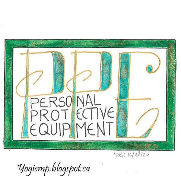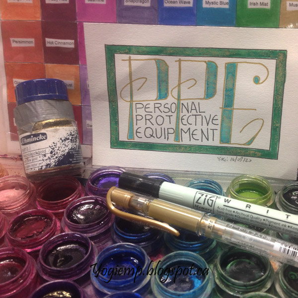 Day 16: (Personal Protection Equipment - PPE) Bee Super Deluxe paper. Funky lettering. Black Zig Writer. Gold Gel pen. Twinkles H2º and Schminke goldpowder,