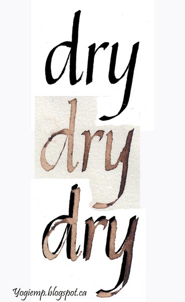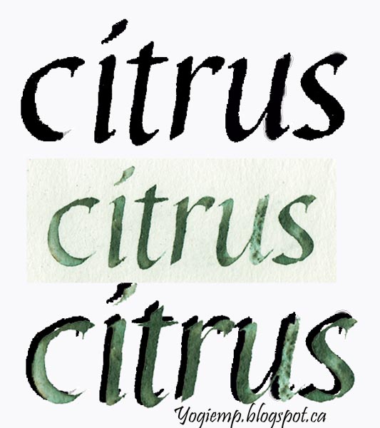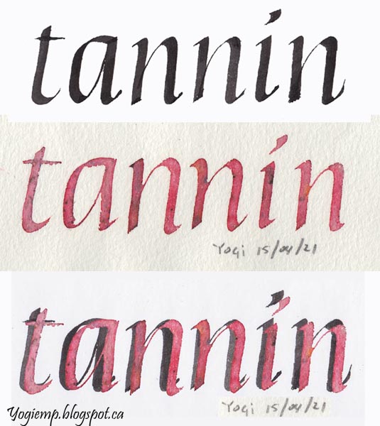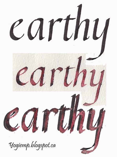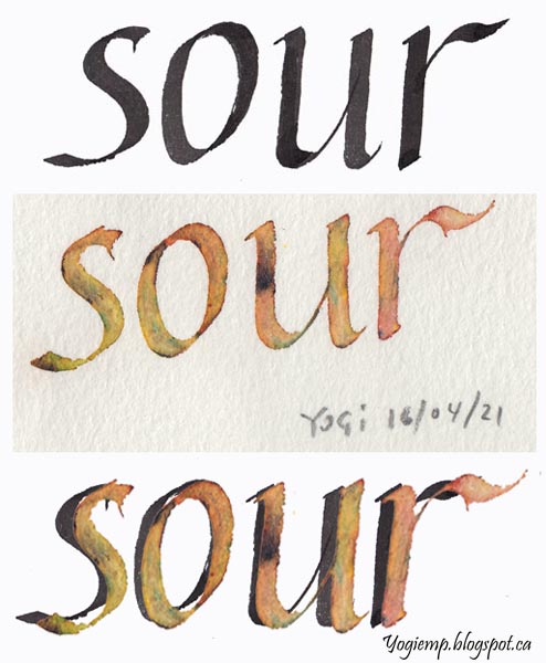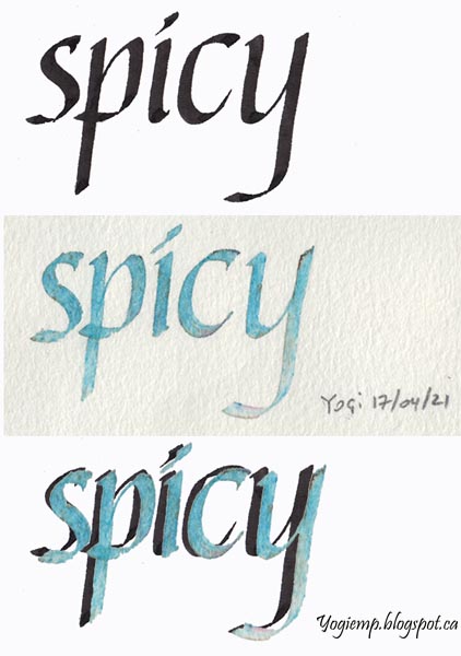 April 11, 2021 I've never done this before and will expand on the technique... The colored images are done on Arches Text Wove and the black images on white 110# Staples cardstock. Both images were then merged in Adobe Photo Shop Elements. I had done the Black lettering using Sumi ink - practicing my Italic from Barbara Close's ZOOM Italic class. Then a friend started me yakking about Bister inks, so I pulled mine out and decided to write my words only using 1 color at a time which I never do... I always use more than one and loving the effect of colors merging... Then I was looking at everything and said to myself I should try merging them to give a shadow effect... Since they're both hand written the merging wasn't as precise as I would have liked, so next time I'll think first and then merge... I enjoyed the experiment.