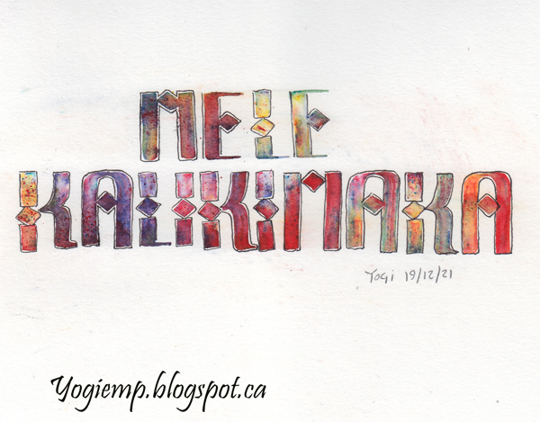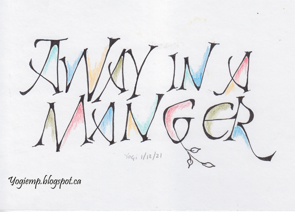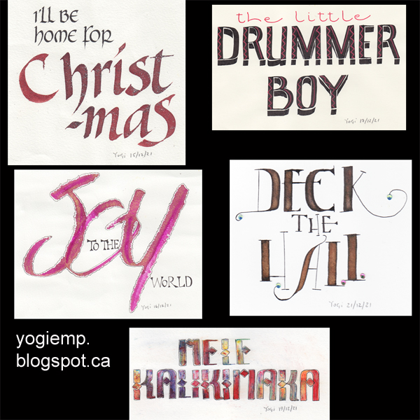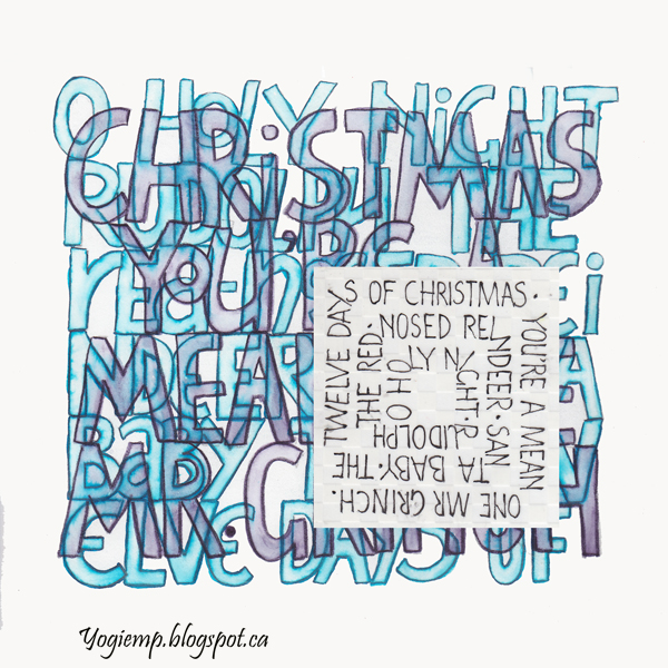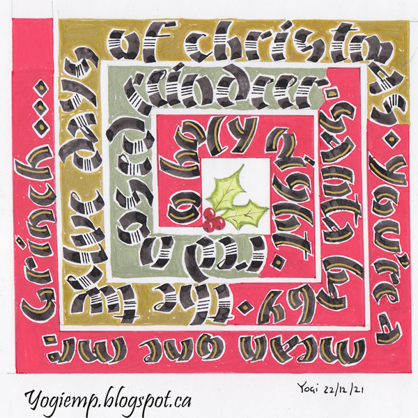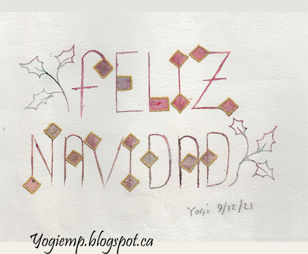 Dec Wk 4 On Arches 90# HP Watercolor paper wrote out the words on the 1st layer using a "Bottle of ink in a Pencil" and then moving the ink around with a wet paint brush. The 2nd layer with a Derwent Inktense "Dark Purple" pencil and again with a wet paintbrush. Final layer written on a checkerboard Vellum paper and using a Tombow Fudensosuke black pen (hard tip) in pressure release lettering. |