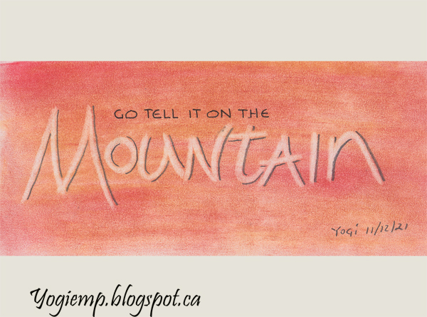 Title: Day 11 - Go Tell It On The On Staples 110# white cardstock applied Pan Pastels in a yellow and red and blended with a sponge. Used an eraser to write out the word "Mountain" and shadowed with a graphite pencil. added the small words with a black Zig writer. |