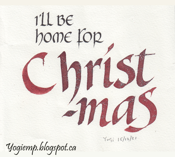 Title: Day 15 - I'll Be Home On Arches Text Wove paper wrote out the main word in my version of Uncial with deAtramentis Dark Red ink and sprinkled the letters while wet with Metallic Silver glitter. Smaller words with a 1.5 Parallel pen and Sumi ink in traditional Uncial style