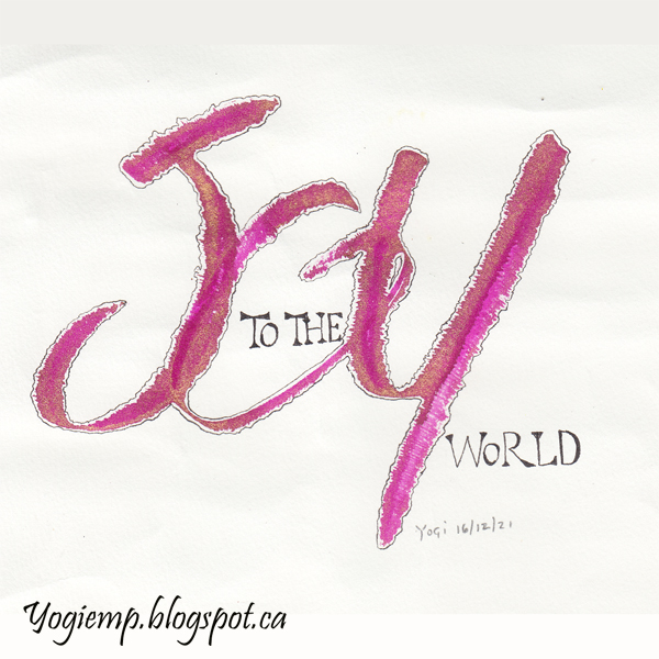 Title: Day 16 - Joy To The World On Arches Text Wove paper and using a Dreaming Dogs "Leeloo" ruling pen wrote out the word "JOY" with deAtramentis Magenta Red/Gold pearlescent ink. Rest of the words with a Tombow Fudenosuke black Brush Pen in a funky monoline. |