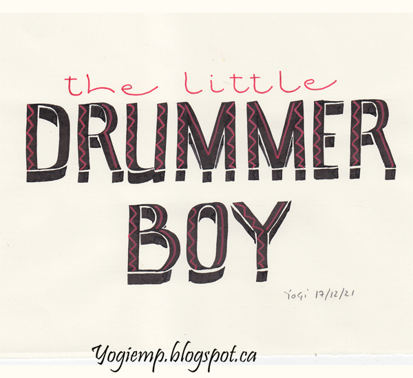 Title: Day 17 - Drummer Boy On Genoa Bond paper wrote out the main words with a 4.5 Parallel pen and Sumi ink in a Shadowed style. Added Artistro red Extra Fine pen details. The smaller words in Akim style with a red Zig Writer.