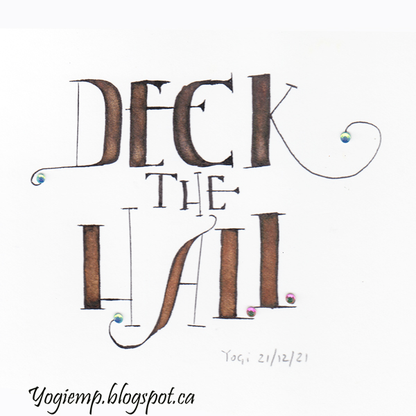 Title: Day 21 - Deck The Halls Size: 6"w x 6"h On Stonhenge paper wrote out the words using a 6.0 Parallel pen and Sumi ink then over writing with a 4.5 pen and deAtramentis Pearlescent Magenta red/gold ink in a funky style. Added mini rhinestones on all the dots. |