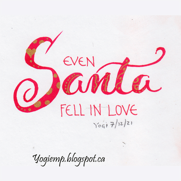 Title: Day 7 - Even Santa On Staples 110# white cardstock wrote out the words with a red Pentel Color Brush pen and a red Zig Writer. Added gold gel pen embellishes in "Santa"