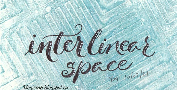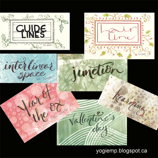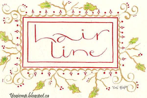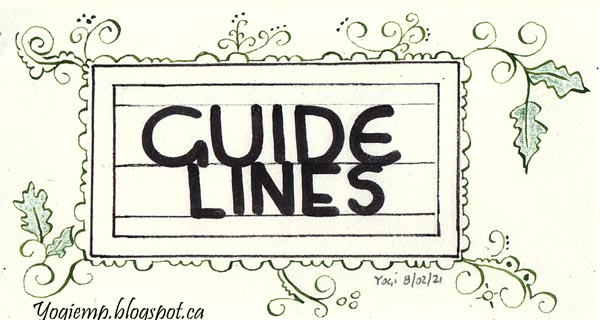 Day 7: Guide Lines Black Zig Writer for the words. Pointed pen and Holbien's green gouache for the filigree work and some colored pencil. |