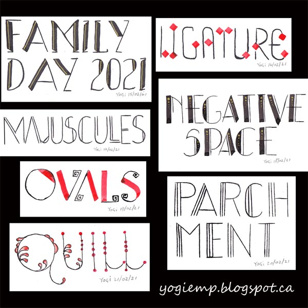 February 12, 2021 I usually love challenges and this one is right up my alley. I decided to go a little different this week... I love seeing fonts onLine and then translating them into calligraphic hands. All are done on various cardstock.