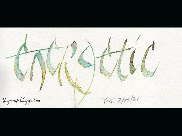 Day 7: Energetic Another Funky style. Used a 3.0 parallel pen and water then sprinkled yellow and blue Bister and a touch of red.