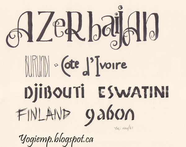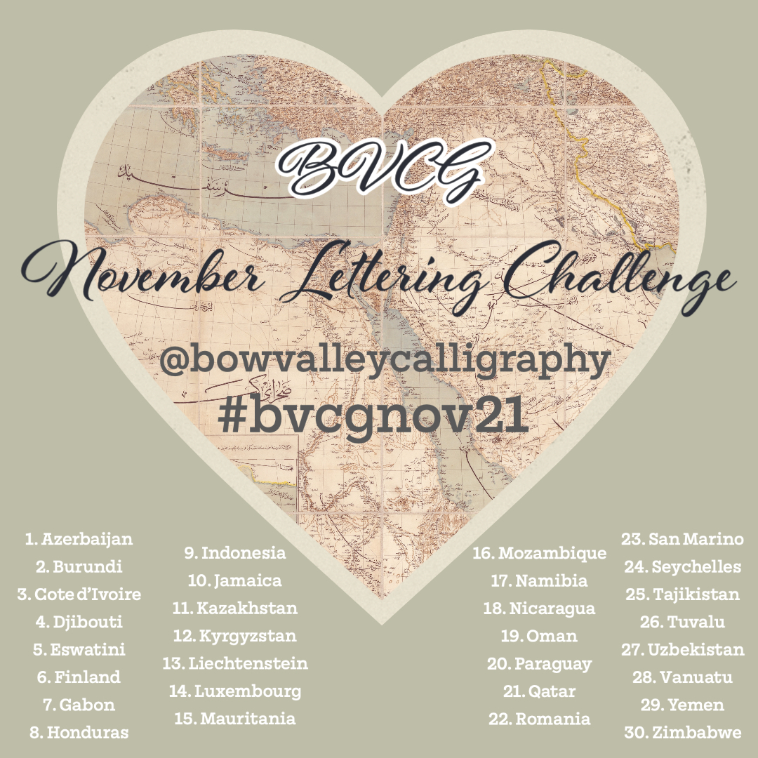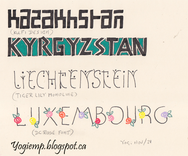 Day 11 - 14 Kazakhstan: 3.0 Parallel pen and Sumi ink in Kufi Design style lettering. Kyrgyzstan: 3.0 Parallel pen and Sumi ink wrote out the word in a monoline style then added color between the letters with an Artistro green brush pen. Liechtenstein: Zig writer in Tiger Lily Monoline style writing Luxembourg: Zig writer in DC Rose Font style lettering. Flowers with Artistro Extra Fine pens.