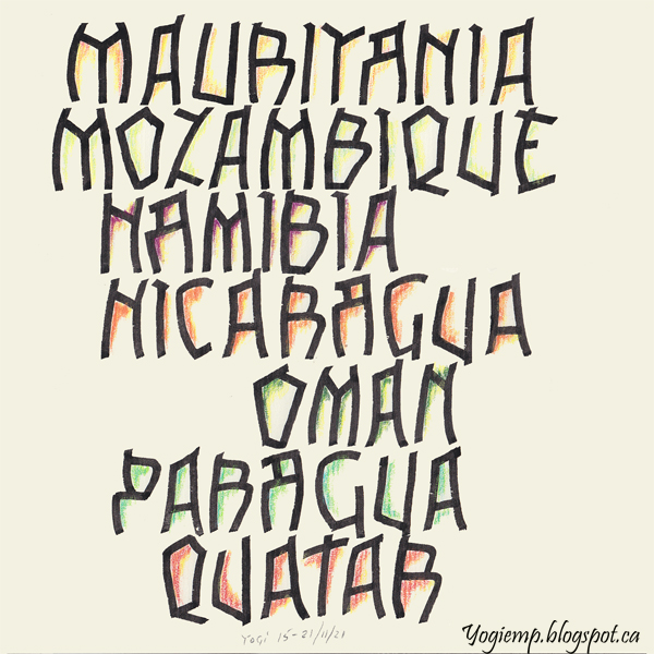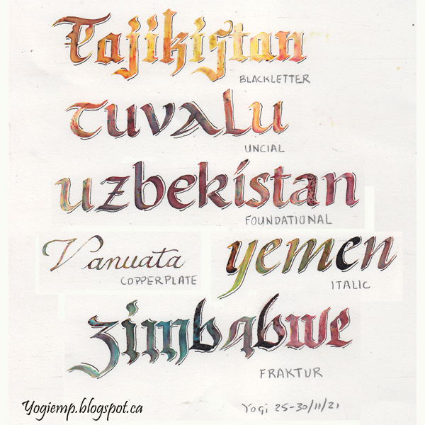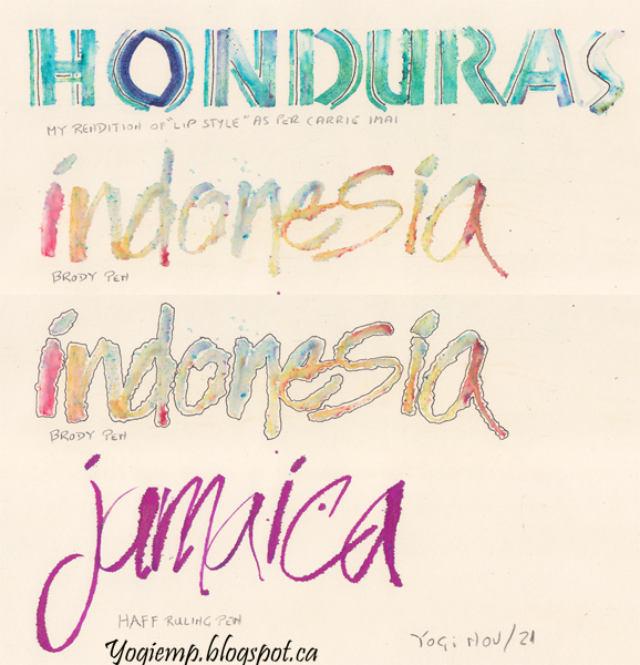 Day: Nov 8 - 10 On beige tone Staples 110# cardstock wrote out the words. Honduras: Sprinkled paper with various colors of Brusho or Color Burst powders and with a 4.5 and a 1.5 Parallel pen and water wrote out the word in my rendition of "Lip" style lettering as taught by Carrie Imai Indonesia: Sprinkled paper with various colors of Brusho or Color Burst powders and with Brody pen wrote out the word. When dry outlined it with a micron pen. Jamaica: using a Haff ruling pen and deAtramentis Magenta/Gold ink wrote out the word. |
