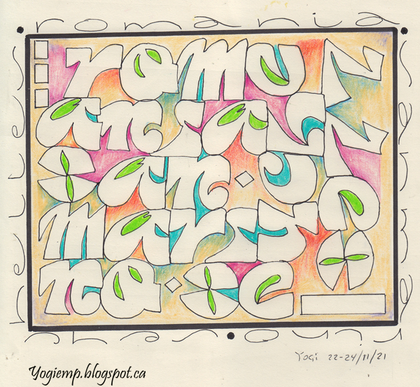 On Strathmore Calligraphy Wove Paper, using a 3.0 Parallel pen and Sumi ink in Liesbeth's style lettering. Shaded with various colored pencils. |
