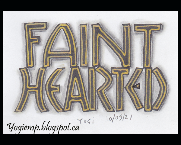 Date: Sept 10, 2021 "Faint Hearted" On Staples 110# white cardstock wrote out the words using a 4.5 Parallel pen and Sumi ink. Lined with a gold gel pen and shadowed with Graphite and paper stump. the Neuland style |