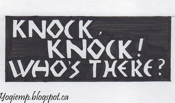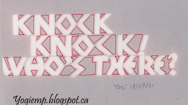 Date: Sept 18, 2021 "Knock Knock! Who's there? On Staples 110# white cardstock wrote my words on paper and then traced onto the cardstock. Painted around the letters with a black Artistro brush pen. On Grey: Stillman & Birn NovaTrio paper. wrote out the words with a 3.0 Parallel pen and (fresh jug) Clorox. Detailed with a red Zig Writer |